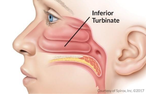 The inferior turbinate is covered with rich vascular tissue. Its function is to warm and humidify the inspired air. It projects from the side wall of the nasal cavity low down and extends the full length of the nasal cavity.